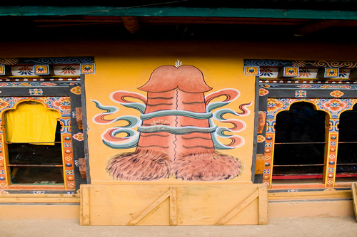 Si algo llama poderosamente la atención es el gusto de los butaneses por decorar las paredes con falos pintados o construir fuentes con forma de pene. En primer lugar porque a simple vista ésta parece una sociedad conservadora y tímida. También porque muchas de esas representaciones fálicas aparecen en templos y lugares sagrados. En realidad se trata de una representación más del peculiar carácter butanés, ya que estos falos son pequeños homenajes a la figura de Drukpa Kunley.